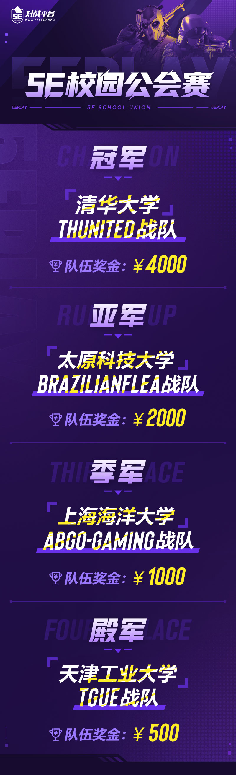 5EPlay作为国内最早一批引入国际性CS:GO赛事的电竞团队,自CS:GO上线之日起便致力于国际CS:GO赛事报道与赛事内容引进,更注重CNCS在校园玩家中的发展。校园公会赛便是5E向校园CS玩家抛出的橄榄枝,希望通过本次比赛让更多的校园选手得到关注。本次5E校园公会赛吸引了90个校园公会,142支队伍参与本次赛事,涵盖了多支CS校园强队,经历了多轮的激励角逐后,最终决出冠军!