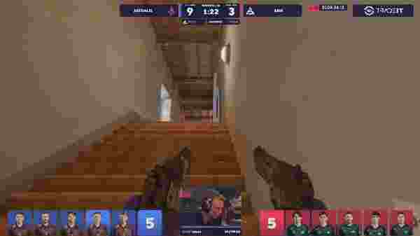 A队故技重施,再次干扰A区,这次换成Staehr一换二,队友见缝插针提速B区打崩对手经济。然而经济局的SAW找到机会,三人重防B区arrozdoce与MUTiRiS双人四杀带领队伍翻盘。次局stavn拿到香蕉道首杀,br0的A区默认也有收获双杀攻破包点再拿一分。第十一局不搜点的A队付出惨痛代价,ewjerkz与MUTiRiS双人四杀捍卫B区荣耀。上半场最终局A队30s进攻B区,stavn左右开弓双杀拿下包点,A队上半场拿到9分。攻防转换后SAW干摸A区,锅炉房的stavn手持双枪双杀劝退土匪转攻B区,dev1ce双杀收尾拿下手枪局。不忍分差扩大的SAW强起进攻A区无果送出赛点。赛点局各自为战的SAW干摸A区被对手逐个击破,最终A队13-3在炼狱小镇取胜。