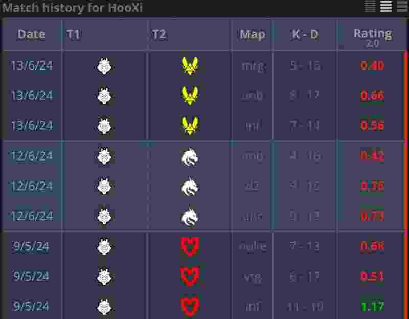 从他列出的战绩表可以看出,HooXi在近期的单场比赛中的击杀数基本都是个位数,Rating也始终处于低位,这在一定程度上拖累了队伍。作为世界顶级战队G2的选手,HooXi必须尽快调整状态。