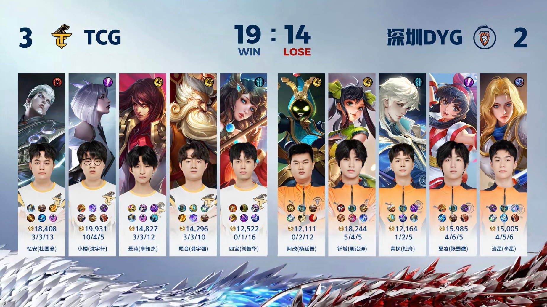 20分钟深圳DYG先杀周瑜和老夫子,但小楼(沈宇轩)镜单杀娜可露露进行止损。22分钟风暴龙王处TCG全力切掉孙尚香,再杀太乙真人,利用大乔的容错率救援传送,零换二后顺利拿到风暴龙王。24分钟TCG破掉三高,尾音(龚宇强)老夫子直接冲脸孙尚香将其击杀,忆安(杜国豪)司空震二连击破,TCG推掉水晶,成功拿下胜利。