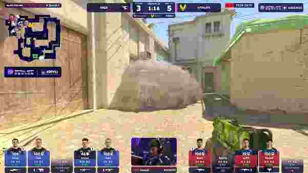 Vitality选图,FaZe先做进攻方,一上来单人佯攻A区,其他四人直接进攻B区,但是被Vitality瞬间刷屏输掉回合,紧接着ECO的FaZe再次进攻B区,但是无奈枪械劣势再丢一分。