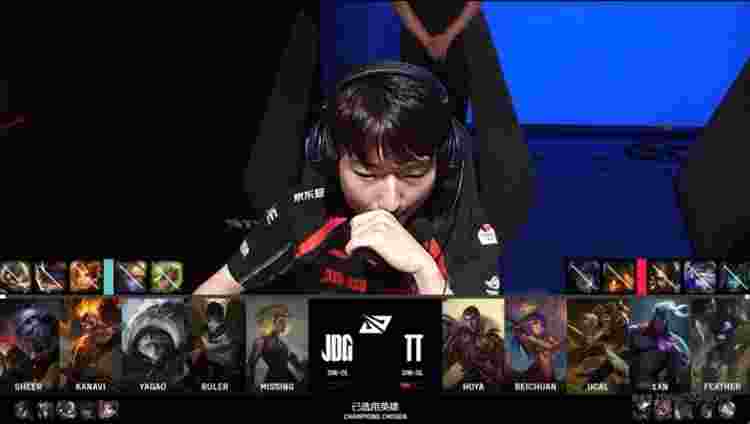 【21:29】芮尔上路被卖,TT四人将其击杀,中路小炮推掉TT二塔,TT五人去开大龙,小炮中路拆掉TT中路水晶,正面杰斯一锤带走烬,小炮中路继续推进拔掉TT门牙,正面火男双杀到手,小炮正面推掉TT基地,JDG扳回一城。