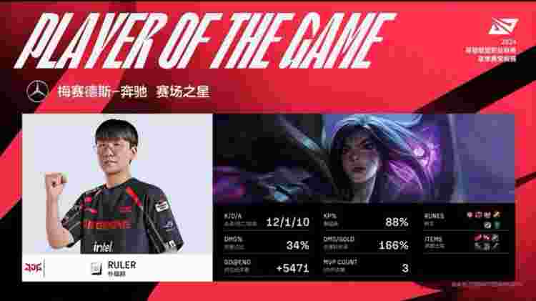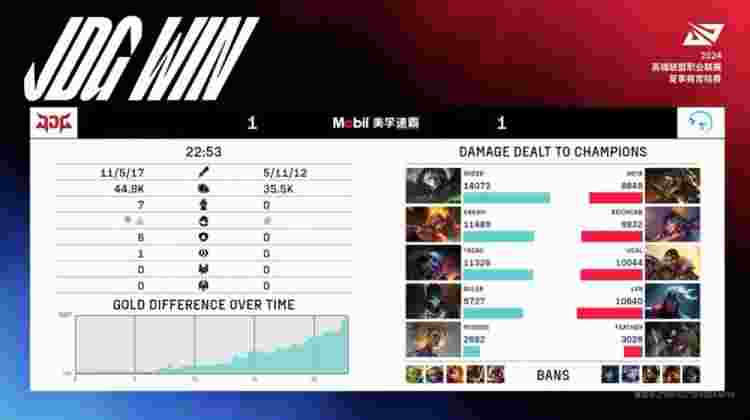 【9:26】泰坦中路一钩牛头开团,永恩开大进场融化泰坦,随后卡莎先杀库奇再杀死歌拿到双杀,死歌开大伤害有限,卡莎击杀卡牌拿到三杀,吉格斯河道1V3反杀残血牛头但还是被卡莎收掉,JDG打出1换5,经济领先2k。