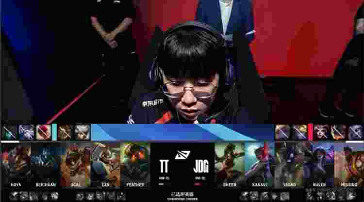 红色方JDG:Sheer奎桑提、Kanavi豹女、Yagao永恩、Ruler卡莎、MISSING牛头