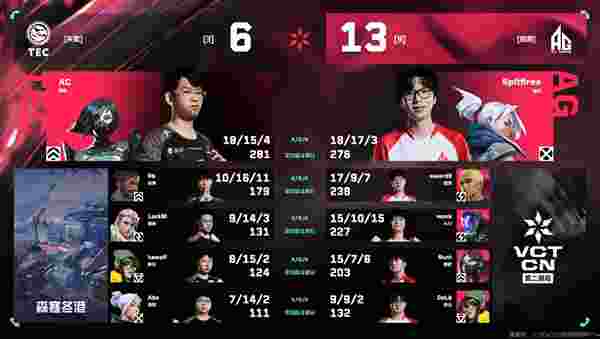 下半场手枪局TEC放慢进攻节奏第二时间进攻A区,kawaii关键双杀决定胜局,TEC取得胜利。长枪局Spitfires开始发力,A区前顶三杀瓦解对手阵型,AG拿到第十分。monk也不甘示弱A点左右开弓三杀将对手送入经济局。不想放出赛点的TEC强起进攻A区,AG早已布下天罗地网拿到赛点。赛点局TEC避其锋芒抱团提速B区,人海战术占下包点扳回一个赛点。手握七个赛点的AG没有给对手更多机会,稳住心态最终拿下比赛。