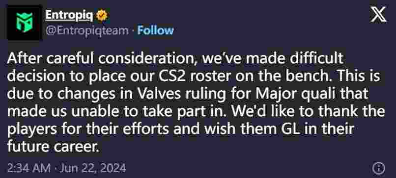 今天Entropiq表示因Major规则调整,他们决定解散旗下CS阵容。而Entropiq并非近期第一家这么做的俱乐部,先前