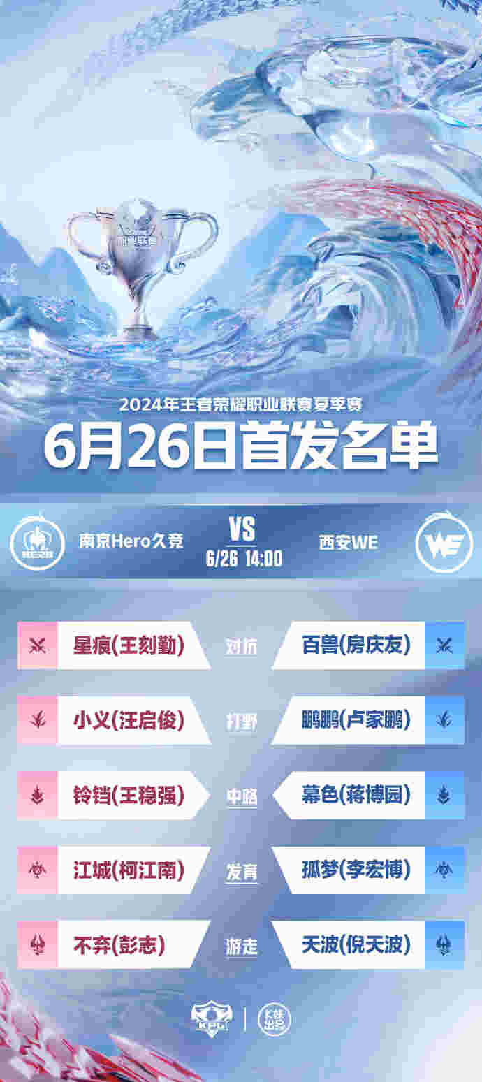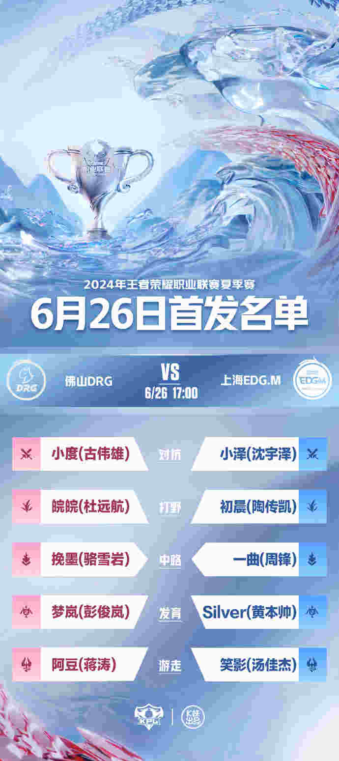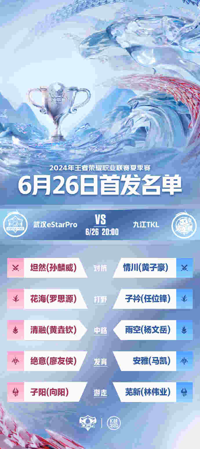 6月26日,KPL官方发布了2024KPL夏季赛常规赛第一轮第三周第一个比赛日的首发名单: