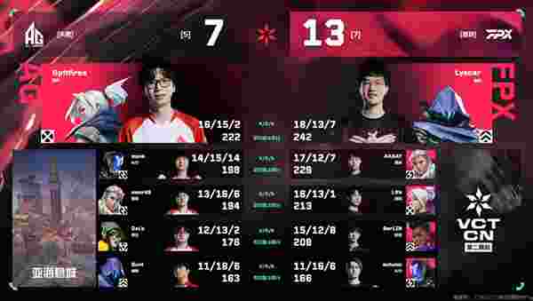 长枪局Lysoa重拳出击,力克千钧1v2残局将对手送入经济局。比赛来到第十七局FPX趁热打铁前压A区瞬间歼灭对手拿到赛点。赛点局放手一搏的AG进攻中路夹击B区,Spitfires三杀拯救队伍扳回一个赛点。士气高涨的AG快攻效果明显吹起反攻号角。但手握6个赛点的FPX并未给对手更多机会,最终13-7取得比赛胜利。