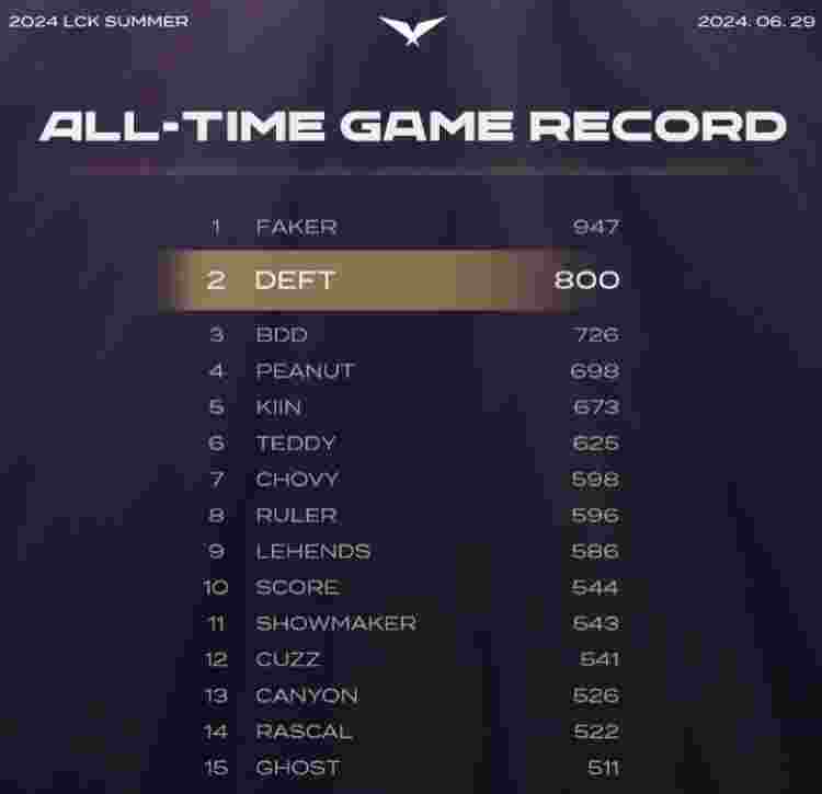 6月29日,在2024LCK夏季赛常规赛KT对阵T1的比赛中,Deft达成了LCK登场800场的成就,排行第二,恭喜Deft!