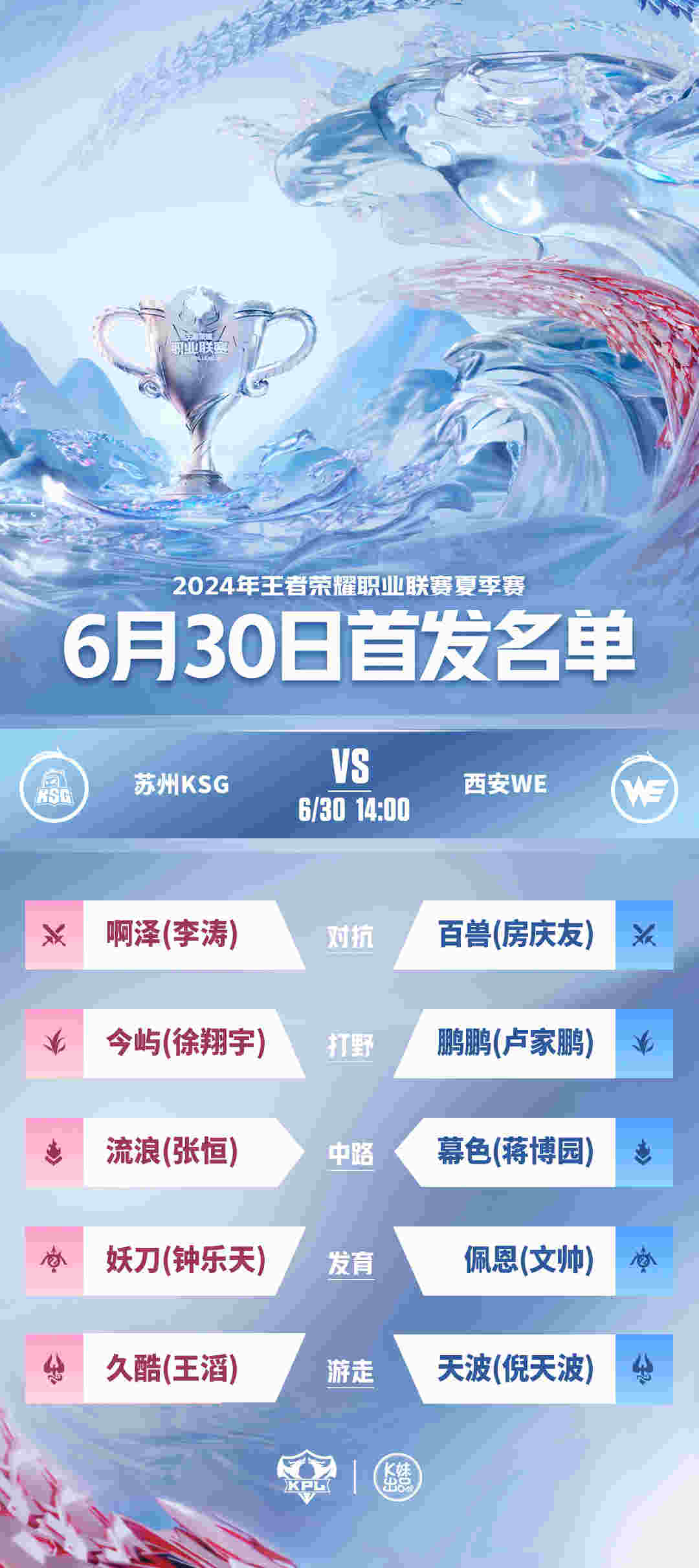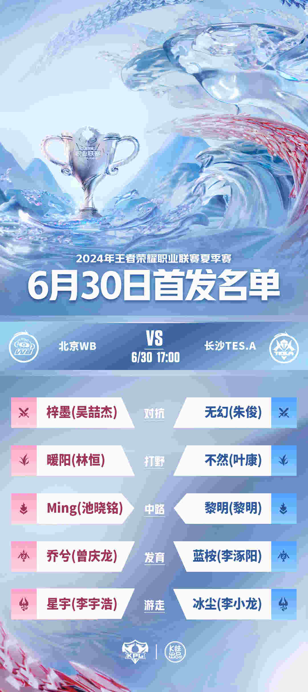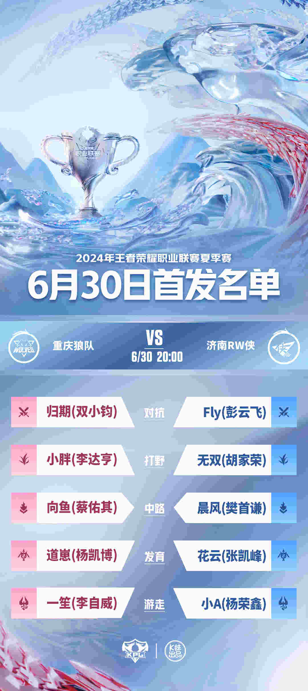 6月30日,KPL官方发布了2024KPL夏季赛常规赛第一轮第三周第五个比赛日的首发名单: