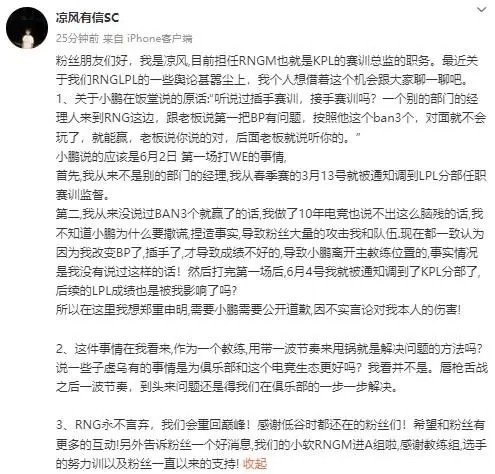 粉丝朋友们好,我是凉风,目前担任RNGM也就是KPL的赛训总监的职务。最近关于我们RNGLPL的一些舆论甚嚣尘上,我个人想借着这个机会跟大家聊一聊吧。