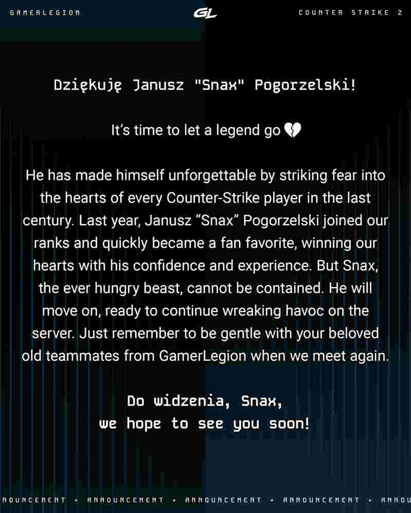 “Snax在以前的每位玩家心中都留下了烙印。他加入了我们的队伍,然后成为了粉丝的最爱,用他的自信和经验赢得了我们的心。他永远是一头饥饿的野兽,势不可挡。将继续前进,在赛场上征战四方。当我们再次见面的时候,记得对你的老队友们温柔点。希望很快能见到你!”