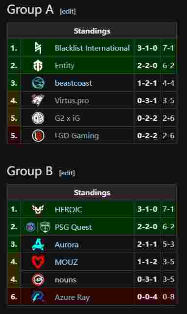LGD则是遭遇了滑铁卢,他们连续以0比2被Blacklist和Entity击败,目前战绩跌落至小组垫底和G2.IG并列
