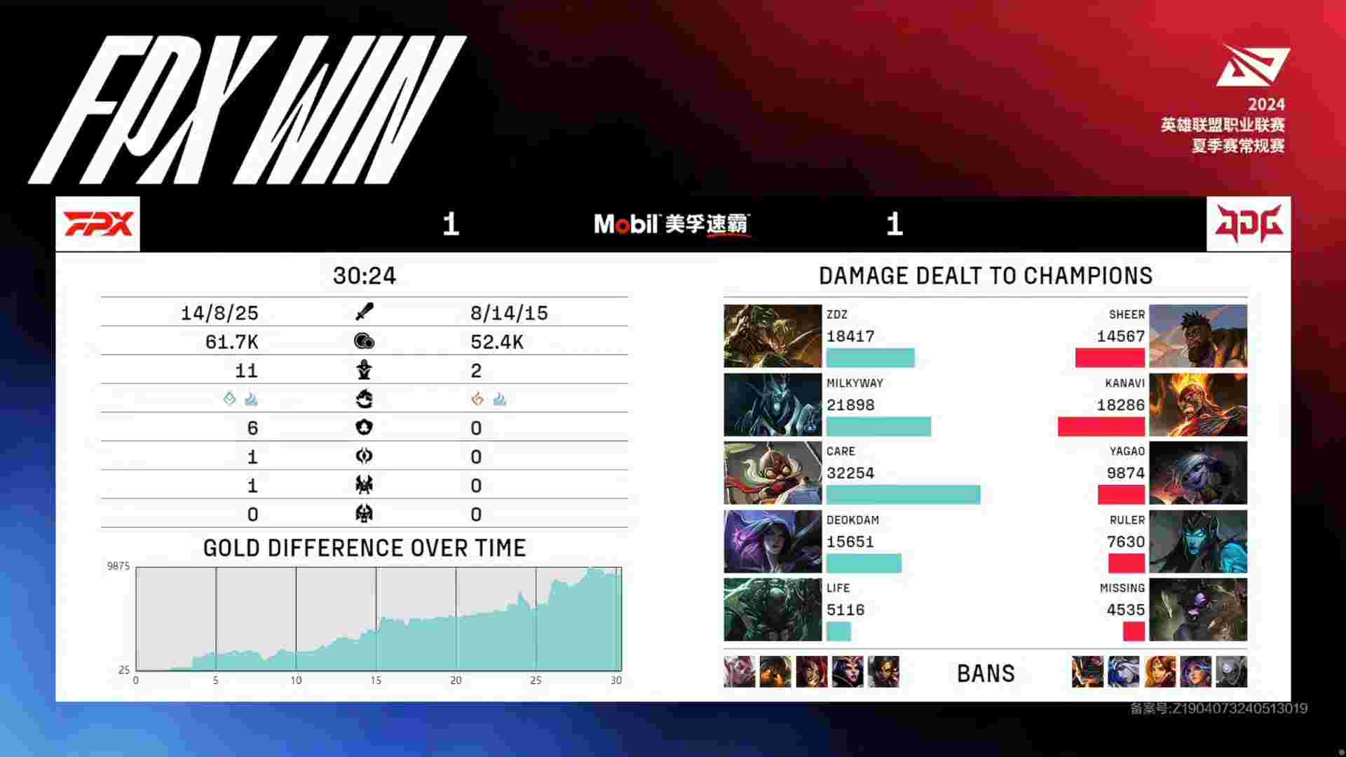 【30:00】JDG来大龙看视野,卡莎鳄鱼下路直指水晶,派克拿命留人,飞机也TP偷家,鳄鱼拆掉门牙塔打碎JDG最后的希望,FPX推掉基地扳平比分。