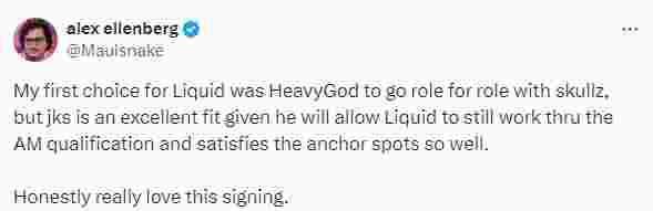 skullz的位置,但jks也非常适合,因为他可以让Liquid参加美洲预选赛,并很好地补强了主点防守者的角色。