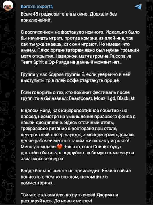 Korb3n:“窗外是整整45度的热浪,我们已经平安抵达利雅得。我们小组赛的赛程有些不尽如人意,如果能先对阵到入围赛晋级的队伍是最理想的,因为已经了解了他们的打法和风格。但不管怎么说我们得接受现实,主办方显然需要一场引人注目的揭幕战。