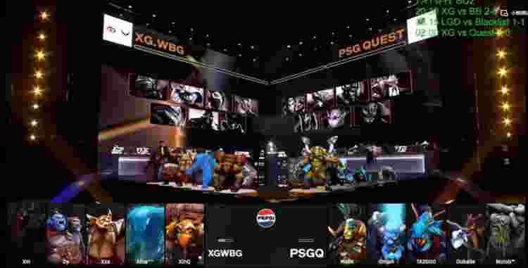 天辉WBG.XG:Xm影魔、Dy食人魔魔法师、Xxs熊猫酒仙、Ame水人、XinQ撼地者