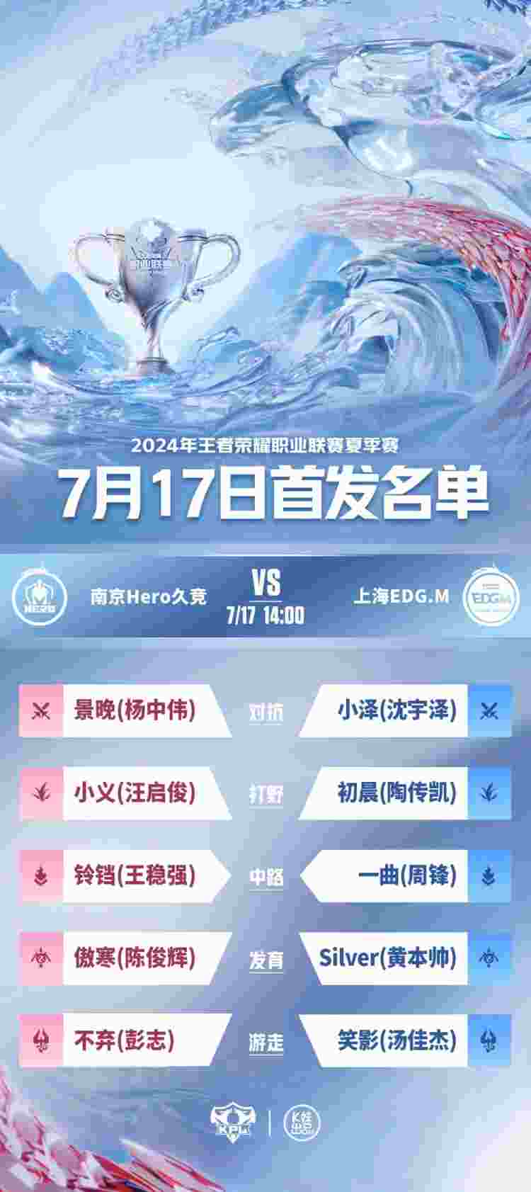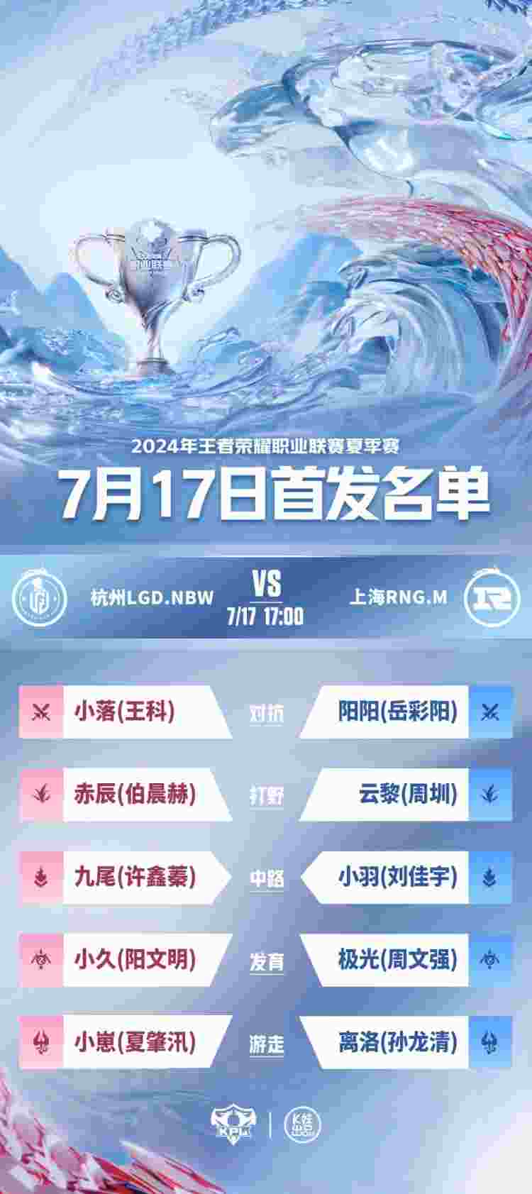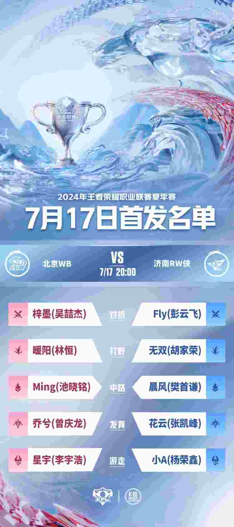 7月17日,2024KPL夏季赛常规赛第二轮W3D1首发名单公布!