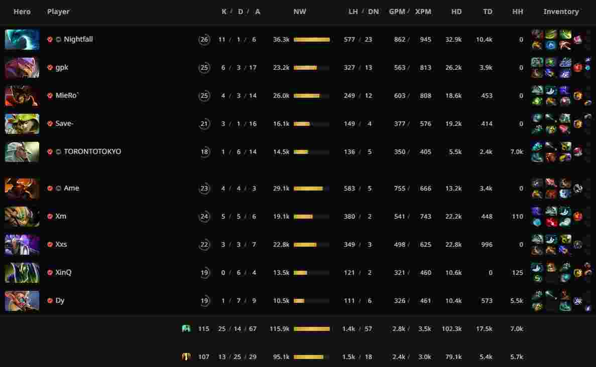 【25分钟】野区团战,Xm电魂被逮捕瞬秒!随后Xxs滚滚开车但是直接被Save墨客带着Ame拍拍熊一起连住了!Nightfall巨魔贴脸开大强杀Ame拍拍熊!BB再打一波0换4之后收下二代肉山!Nightfall巨魔带盾!