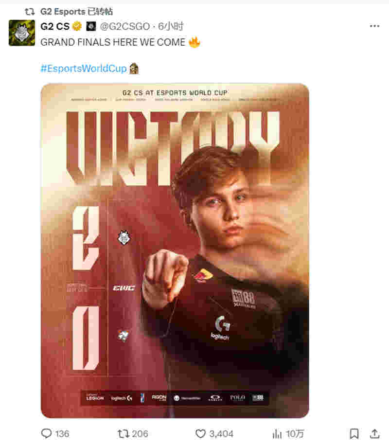 G2在EWC电竞世界杯半决赛中以2-0的比分战胜了