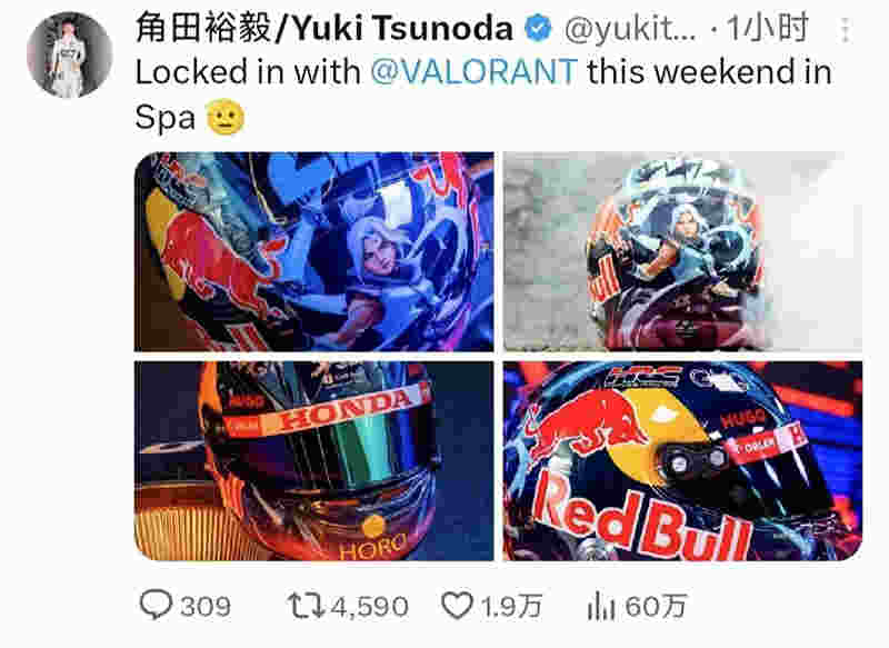 据悉,日本F1车手角田裕毅将在本周F1比利时大奖赛使用无畏契约主题的头盔!