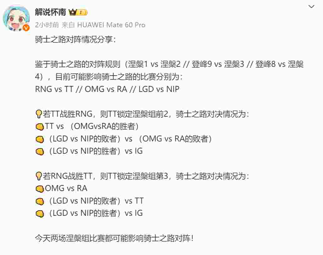 若TT战胜RNG,则TT锁定涅槃组前2,骑士之路对决情况为: