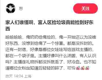 近日,国内某社媒有网友发帖称在富人区“捡垃圾”,捡到疑似粉丝送给RNG中单选手Tangyuan的礼物和手写信,且均未开封