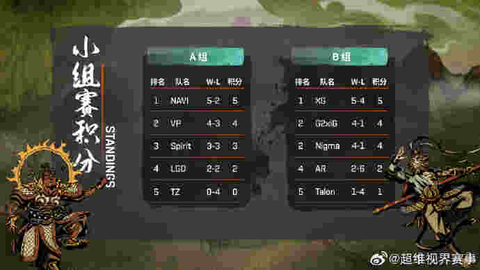 B组XG积5分位列小组第一,G2 x iG、Nigma同积4分并列第二,AR积2分排名小组第四,Talon则仅积1分小组垫底。