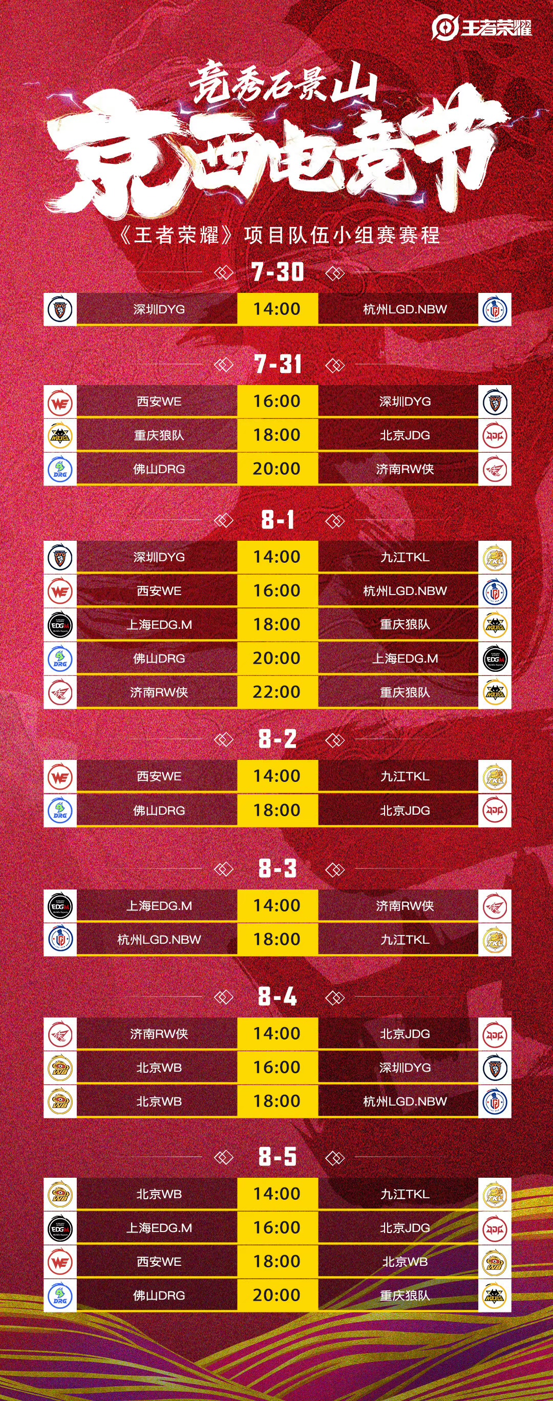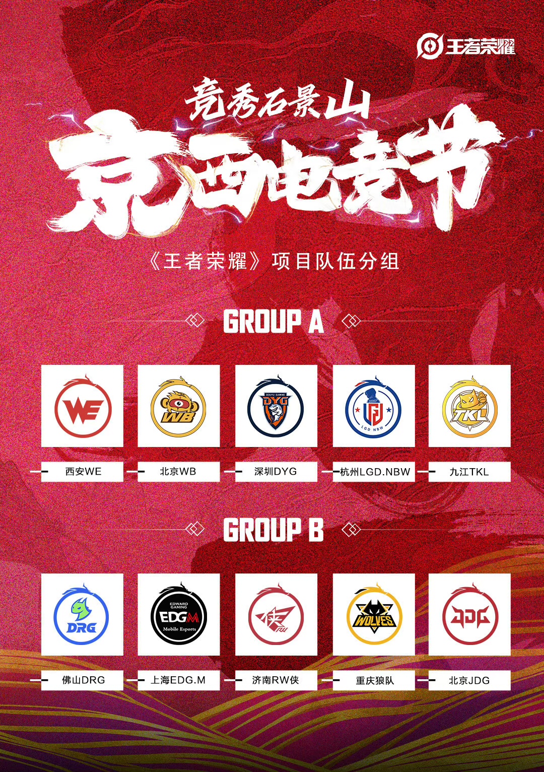 B组:佛山DRG、上海EDG.M、济南RW侠、重庆狼队、北京JDG