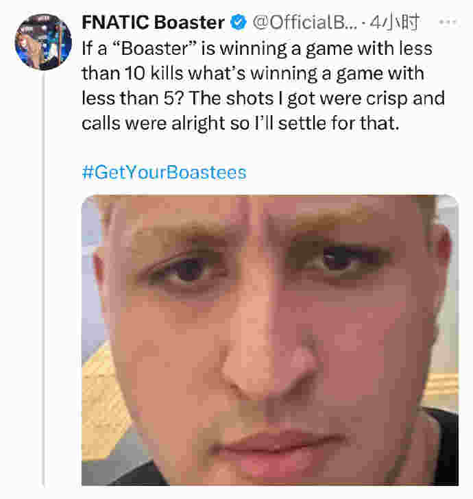 日前,大B老师在赢下G2后发文:如果一场获胜的比赛中“Boaster”的击杀数少于10次(大家就开始质疑躺),那么少于5次那又算什么呢?我的枪法很准,指挥也不错,所以我对自己挺满意的。