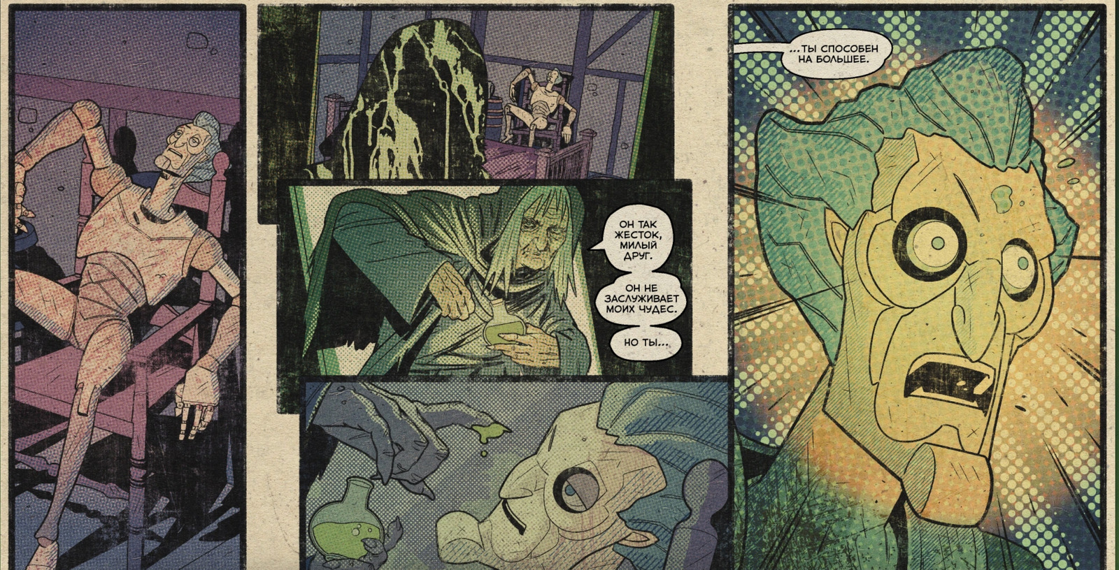 当凯特尔喝醉了,让马里奥内托无人看管时,女巫复活了这个生物。它处理了这个女人和奥斯伯特·凯特尔(Osbert Kettle),然后开始以艺名Koliostro在马戏团表演。