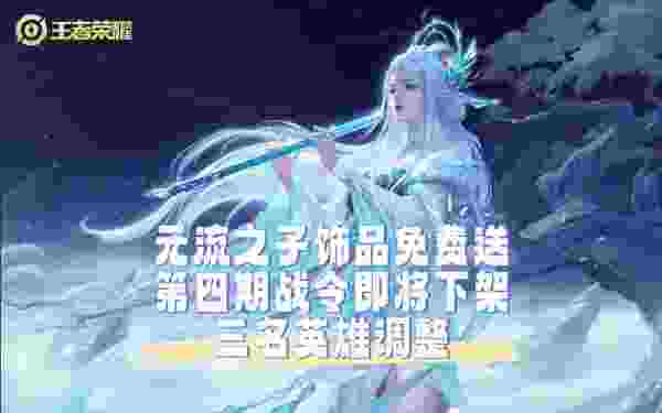 一是累积对局免费送元流之子的饰品,其次小雨要提醒大家第四期战令即将下架啦,另外还有对少司缘、貂蝉以及露娜三名英雄的调整。