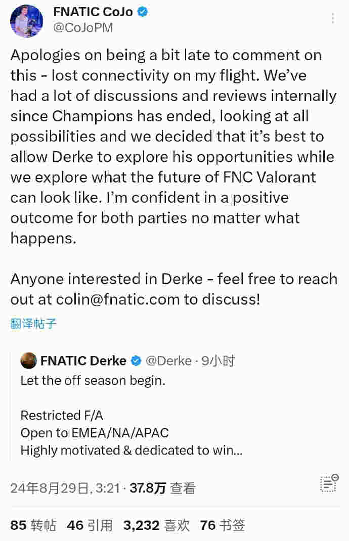 随着Derke在推特上公布自己成为限制自由人,寻找新东家之后,Fnatic俱乐部的团队总监CoJo对此也进行了评论: