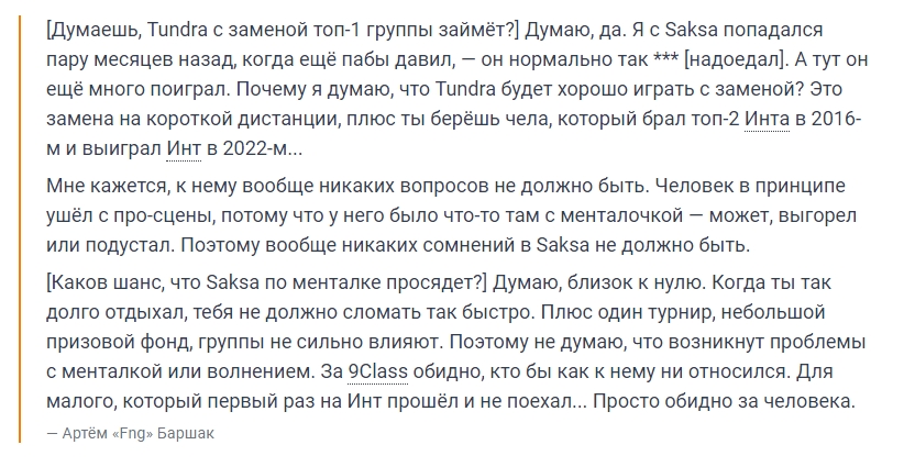 “[你认为Tundra战队这次换人后还有机会获得小组赛第一吗?]几个月前,当我在排位时,我遇到了Saksa--他很***厉害。而且他现在已经玩了很多场了。为什么我认为 Tundra 在有他的情况下会打得更好?首先他只是作为一个短时间替补出场,再加上你带着一个在 2016 年拿下国际邀请赛前 2 并在 2022 年赢得国际邀请赛冠军的家伙......