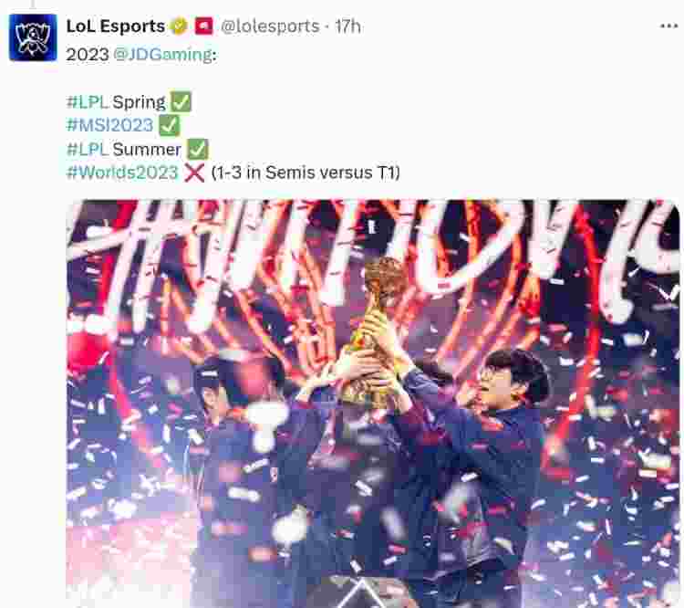 2023年JDG战队:2023LPL春季赛冠军,2023MSI冠军,2023LPL夏季赛冠军,S13全球总决赛四强(1-3不敌T1)。