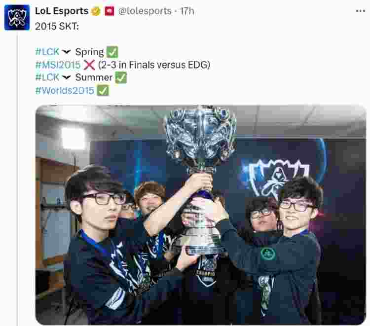 2015年SKT战队:2015LCK春季赛冠军,2015MSI亚军(2-3不敌EDG),2015LCK夏季赛冠军,S5全球总决赛冠军。