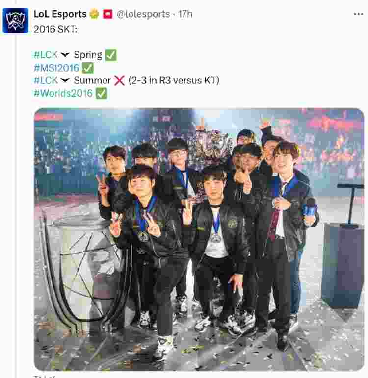 2016年SKT战队:2016LCK春季赛冠军,2016MSI冠军,2016LCK夏季赛季军(2-3不敌KT),S6全球总决赛冠军。