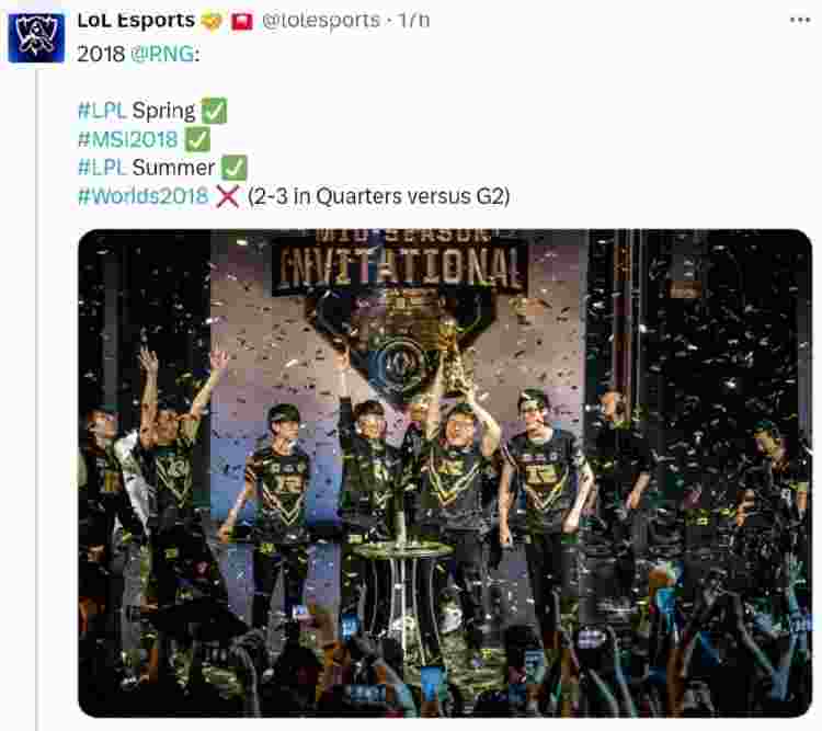 直播吧9月11日讯 LOL官推盘点历届最接近达成大满贯的队伍,分别为SKT、RNG、G2、JDG,详细内容如下: