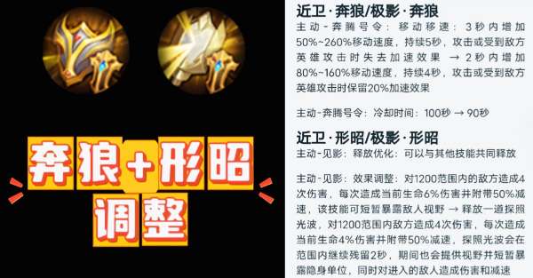 同时,辅助装备的主动技能改版,奔狼,3秒内增加移速,变成了2秒增加移速,同时持续时间5秒变成了4秒,并且调整了加速比例的同时,也增添了保留攻速的机制,这种调整,是为了提升奔狼的下限,同时降低了上限。