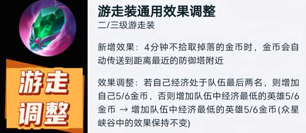 辅助装备的游走被动调整,只会对经济最低的队友生效,也就是说本赛季强势的中单,对抗路宝石流打法,将会彻底成为历史,游走将会重回本有的机制。