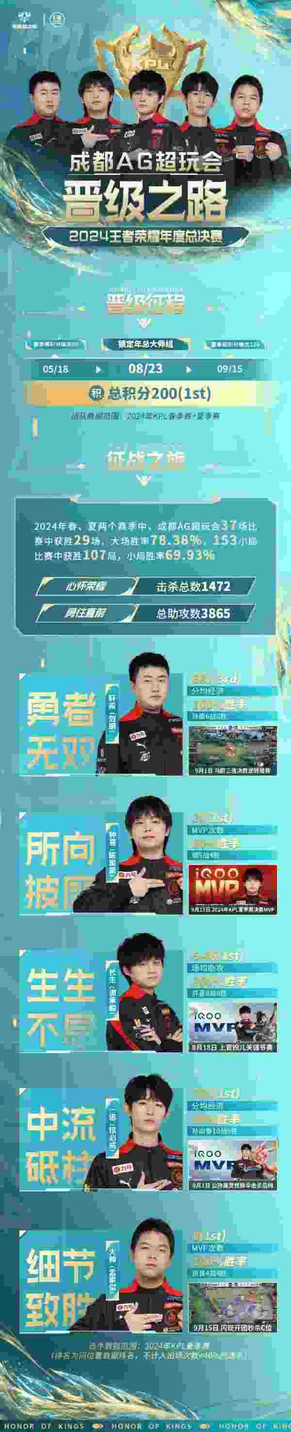2024年春、夏两个赛季中,成都AG超玩会37场比赛中获胜29场,大场胜率78.38%;153小局比赛中获胜107局,小局胜率69.93%。