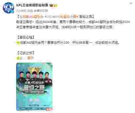 成都AG超玩会两个赛季总积分200,积分排名第一,成功锁定大师组。
