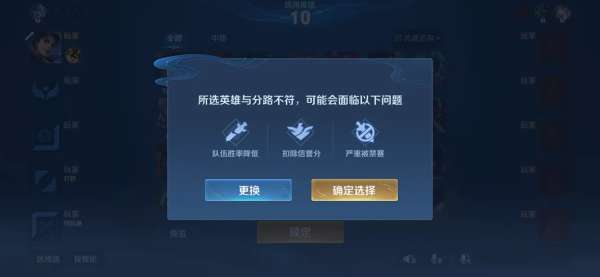第二个,不管是什么分段,只要你选择了跟预选分路冲突的英雄,系统都会进行提示,如果局内还打不好的话,则会大概率扣除非常多的信誉分,甚至是禁赛。