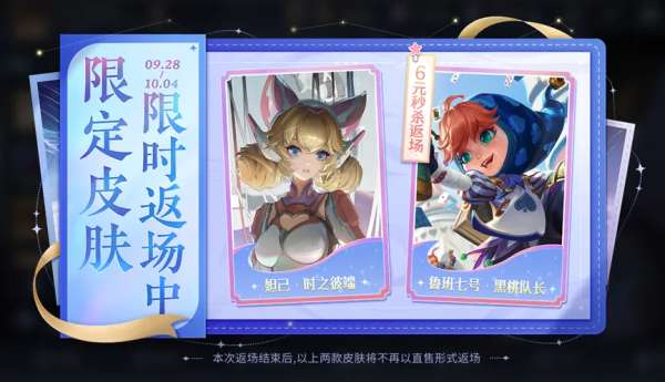 9月28日至10月4日,则会返场妲己的“时之彼端”和鲁班七号的“黑桃队长”,价格分别为888点券和60点券。
