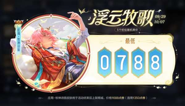 首先,10月8日会上架庄周的新皮肤“牧神诗旅”,品质为传说,首周价格是1350点券。
