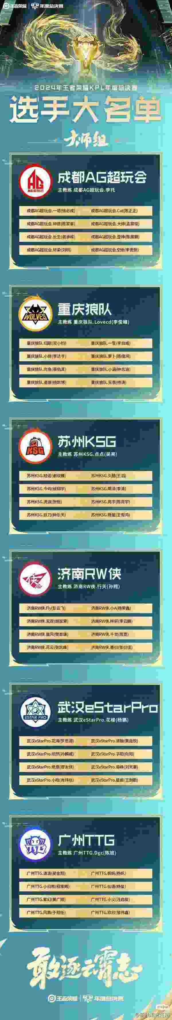 1.成都AG超玩会:人员配置上是冠军队伍班底加上壶神,CAT,空绝。实力非常强劲。唯一的变数是空绝的实力是否能撑得住AG的中轴,AG是靠中野节奏辐射双边来赢游戏的。在擂台赛阶段可能会失去一些小分。如果是稳定失去空绝这一分的话,AG有可能稳不住大师组前四从而进入突围赛。不过擂台赛过后AG稳定的五人组大概率还是会进入决赛,依然是夺冠大热门