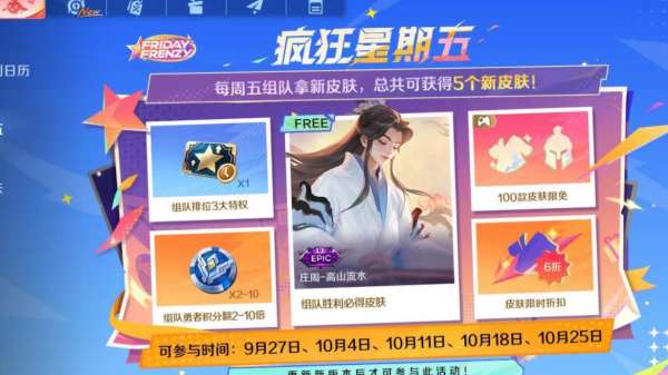 而周年庆的活动项目,在近期也已经曝光了,如下图所示,最近王者荣耀国际服上线了一个叫做疯狂星期五的活动,可以看到,这个活动需要玩家在星期五的时候组队,只要组队游戏,就可以获得五款新皮肤。