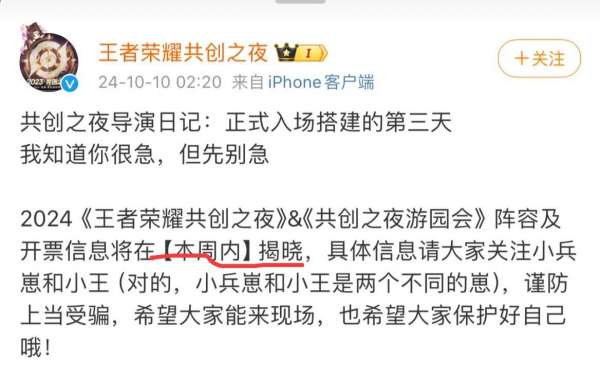 如今已经到了十月份中旬,再过一段时间,王者荣耀就要迎来九周年庆了,在前段时间王者官方就说过,在今年周年庆,王者荣耀将会迎来一个共创之夜。而在近期,王者官方也对共创之夜的内容进行了一些预热,如下图所示,官方称共创之夜的阵容还有开票信息都会在这个星期之内揭晓。