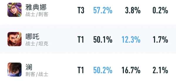 以上则是他们三人的顶端局数据,雅典娜虽然出场率低了点,但胜率却高达57.2%,位居全英雄榜首,哪吒和澜也有很高的优先级,算是彻底被公式化的肉装流给“救赎”。
