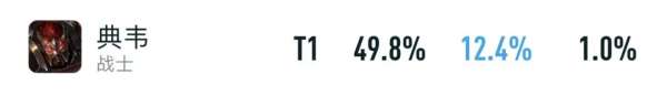以上则是典韦目前的巅峰赛数据,虽然表现比赛季初要差了不少,但还是有着49.8%胜率+12.4%出场率,处于打野榜的中上水平。